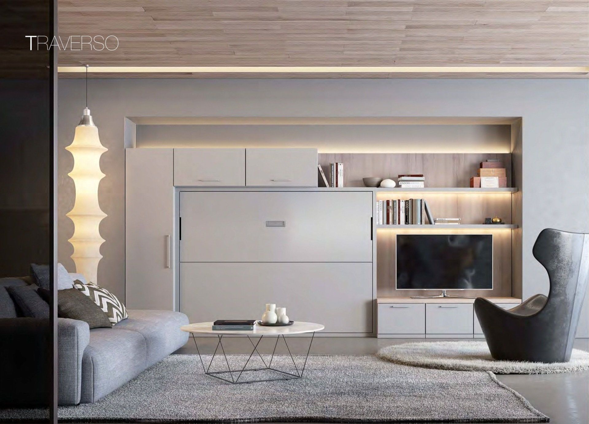 Sistema trasformabile composto da un letto matrimoniale verticale pronto all’uso. Nella versione giorno si ha a disposizione un tavolo che scompare con l'apertura del letto e si posiziona sotto la rete. Libreria interna porta guanciali solo nella profondità cm 44,6 e 60,6. Previste in opzione luci di lettura ad incasso con accensione indipendente. La dotazione del letto comprende una rete ortopedica con doghe in legno di faggio.