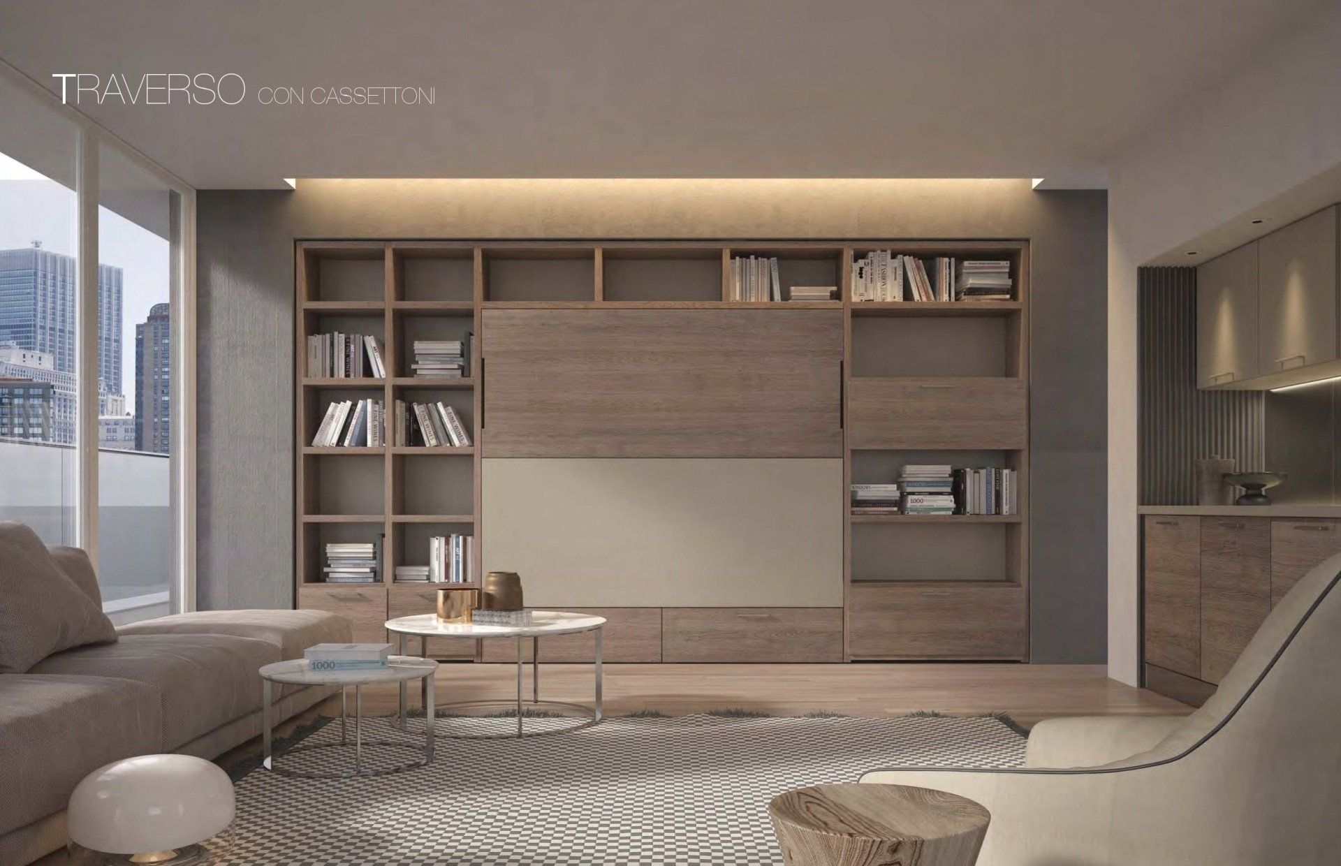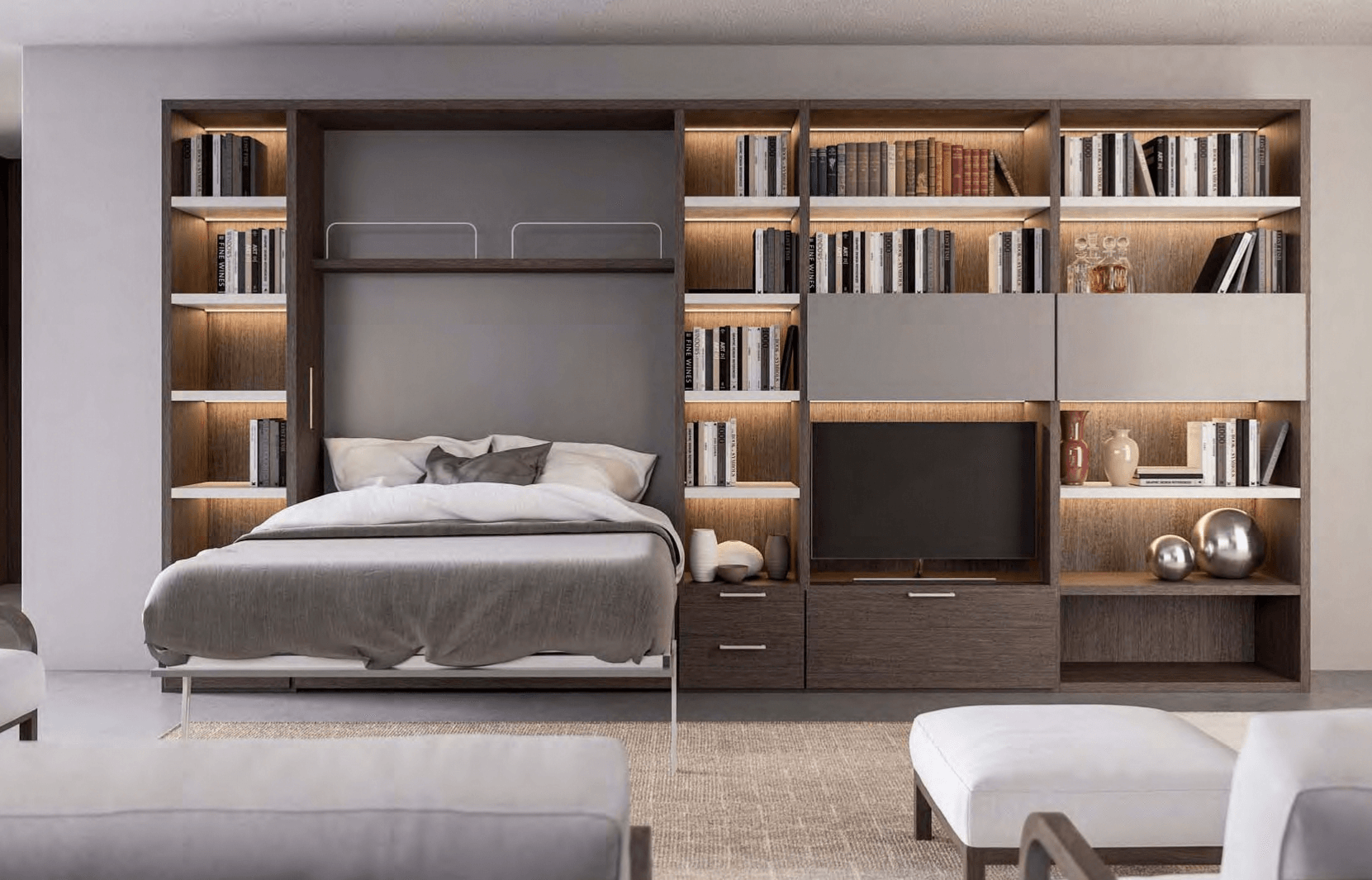 Sistema trasformabile composto da un letto matrimoniale abbattibile orizzontale pronto all’uso. Nella versione giorno si hanno a disposizione due cassettoni indipendenti estraibili su rotelle. Previste in opzione luci di lettura ad incasso con accensione indipendente. La dotazione del letto comprende una rete ortopedica con doghe in legno di faggio.
