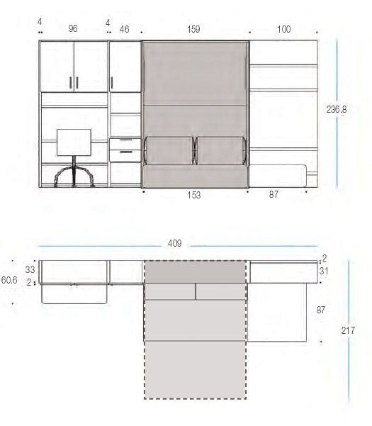 Sistema trasformabile composto da un letto francese verticale pronto all’uso. Nella versione giorno si hanno a disposizione due cassettoni indipendenti estraibili su rotelle. Libreria interna porta guanciali solo nella profondità cm 44,6. Previste in opzione luci di lettura ad incasso con accensione indipendente. La dotazione del letto comprende una rete ortopedica con doghe in legno di faggio.